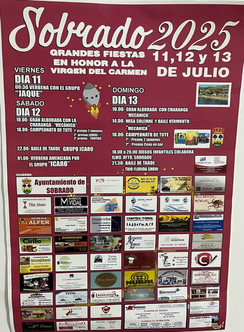 El día 11 de julio la celebración  de la Virgen del Carmen en Sobrado marcará  el inicio de las fiestas patronales en nuestro Municipio. A lo largo de todo el verano  en casi todos los pueblos de nuestro Ayuntamiento también se organizaran fiestas  para rendir homenaje al Santo o Santa  Patrona de cada localidad.